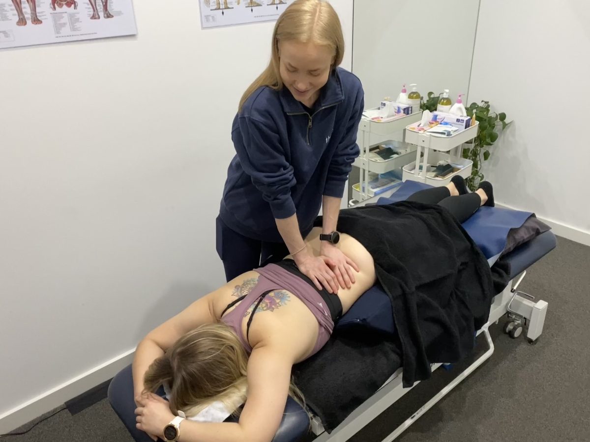 Women's health physiotherapist Sophie provides scar tissue massage and lymphatic drainage massage to a breast cancer survivor who is lying down.